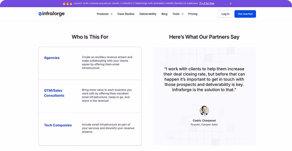 Infraforge is a private, dedicated cold email infrastructure solution with white label and reseller programs. Agencies can sell it as their own infrastructure stack - including dedicated IPs, domain setup, multi-IP provisioning, and automated DNS (SPF, DKIM, DMARC) configuration.